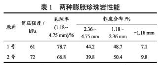 試驗所用兩種膨脹珍珠巖筒壓強(qiáng)度、孔隙率、粒度分布等性能測試結(jié)果見表1。由表1可知,不同企業(yè)生產(chǎn)的膨脹珍珠巖筒壓強(qiáng)度和孔隙率差異較大,曲度分布較廣,有一定的細(xì)粉含量。
