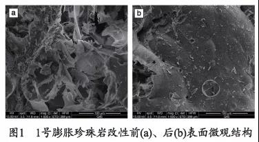以1號膨脹珍珠巖為樣品,篩取粒徑為1.18-2.36mm的兩份1號膨脹珍珠巖,其中一份按照步驟2進(jìn)行改性,研究改性前后膨脹珍珠巖的筒壓強(qiáng)度性能變化情況。改性前后膨脹珍珠巖筒壓強(qiáng)度測試值見表2,改性前后膨脹珍珠巖顆粒表面形貌,見圖1。由表2可見,1號膨穢珠巖改性后,其筒壓強(qiáng)度由改性前的64 kPa提高至95 kPa,筒壓強(qiáng)度提高48.44%o這是由珈過MIMS預(yù)聚物改性后,膨瞬珠巖表面的開放孔被改性劑填充,且表面形成了具有一定強(qiáng)度和韌性的聚合物覆蓋膜叫該聚合物覆蓋膜可使膨脹珍珠巖顆粒強(qiáng)度提升,且降低膨脹珍珠巖粉化率,從而使膨的筒壓強(qiáng)度得到優(yōu)化提升。