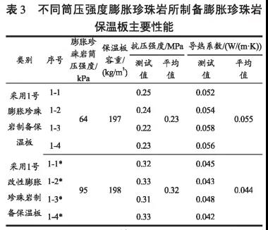 以改性前后的1號膨脹珍珠巖為主要原料制備兩組膨脹珍珠巖保溫板,從而研究膨脹珍珠巖筒壓強(qiáng)度的差異對保溫板性能造成的影響,兩組膨脹珍珠巖保溫板性能,見表3。